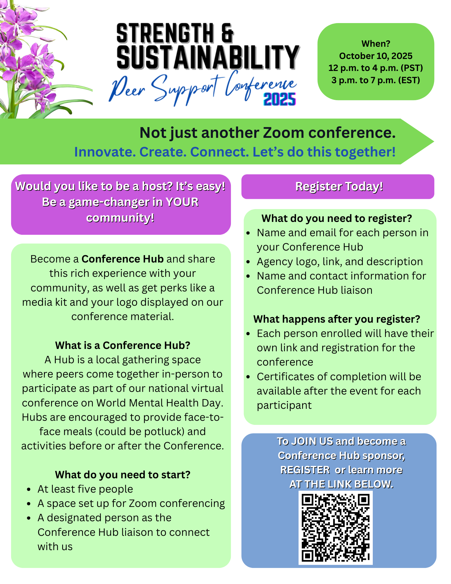 Description:Not Just Another Zoom Conference!We are pulling together to innovate, create and connect. Let's do this together! We will create and collaborate on music and art using our strengths and cutting-edge AI technology. We will dig deep into the roots of the Peer Movement and connect that to our collective advocacy today. This is an opportunity to connect locally and nationally in solidarity celebrating our future on World Mental Health Day. #PeerStrong #StrengthAndSustainability2025 #PeerEntrepreneurs #PeerPioneers #LetsDoItTogether |